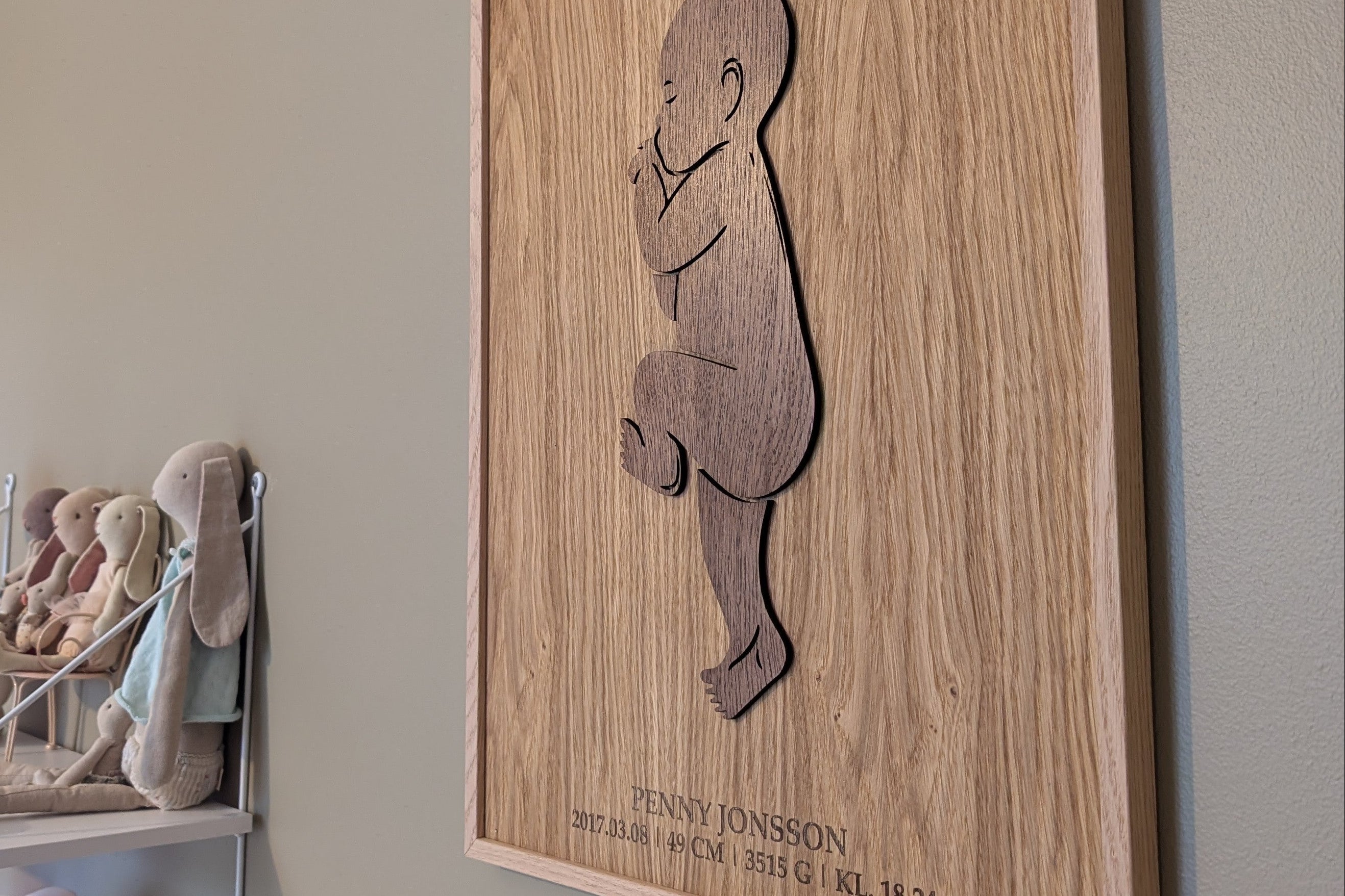 Vår huvudprodukt är en födelsetavla där du får en illustration av din nyfödda bebis i naturlig storlek, i skala 1:1