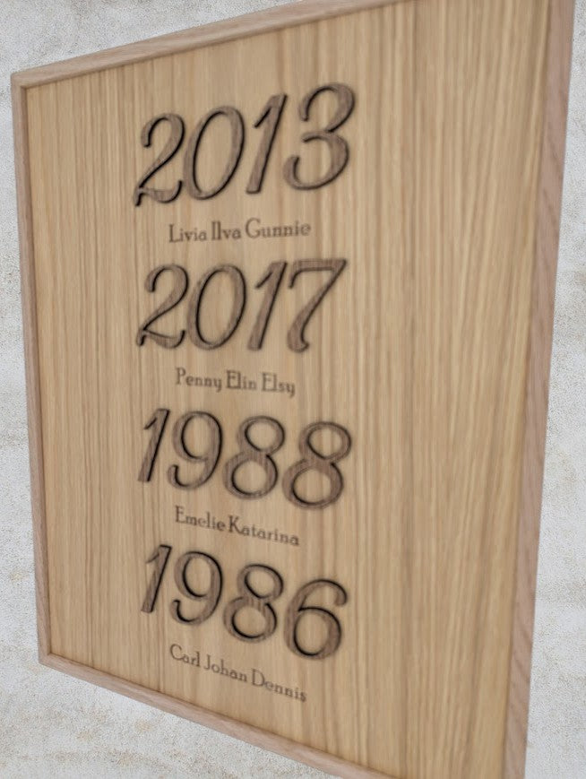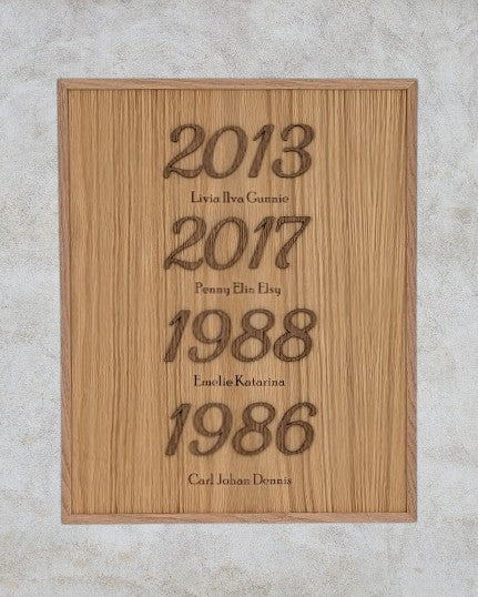 Tavlan designas med varje familjemedlems namn och födelseår.
