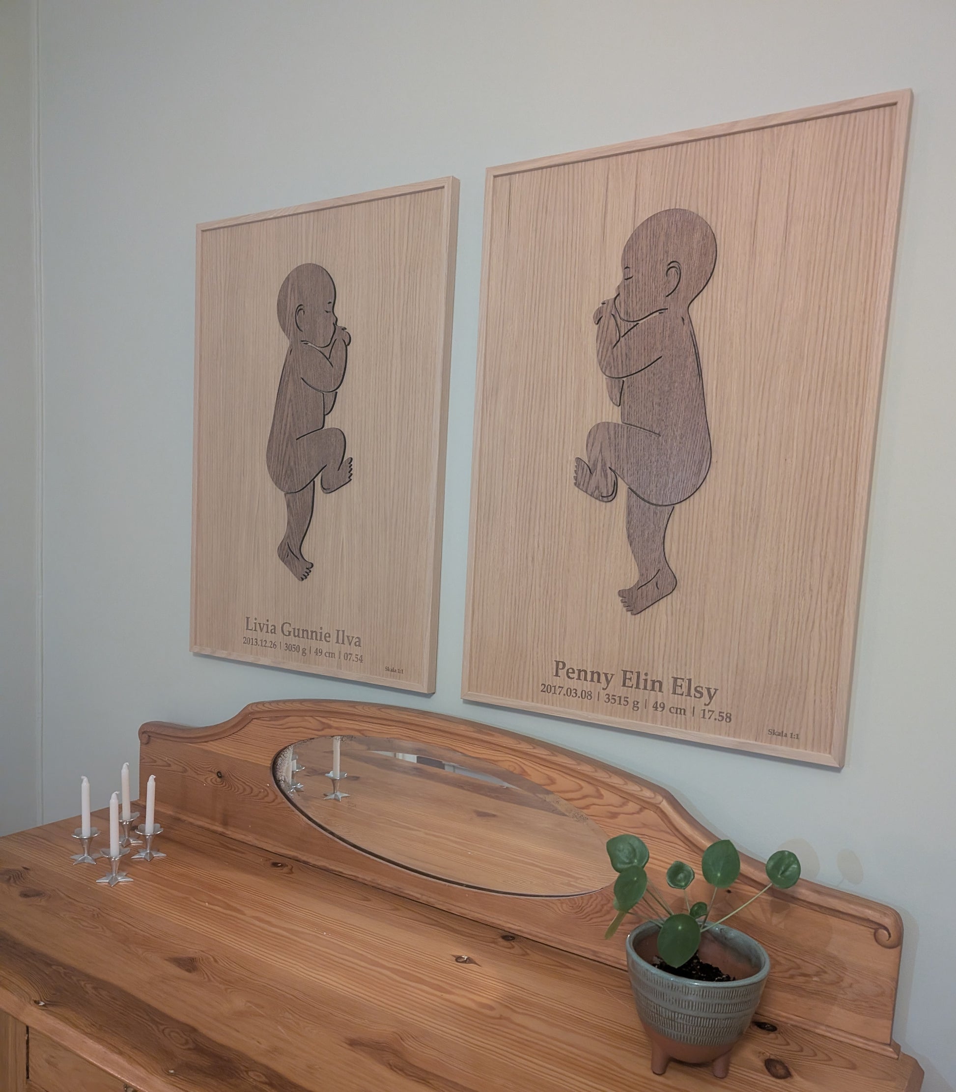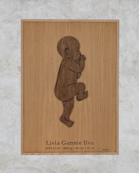 Därefter skapar vi en unik och personlig födelsetavla där bebisen på tavlan blir lika lång som ditt barn vid födseln. Längst ned på tavlan är barnets födelsevikt- och längd samt namn och födelsedatum ingraverat.