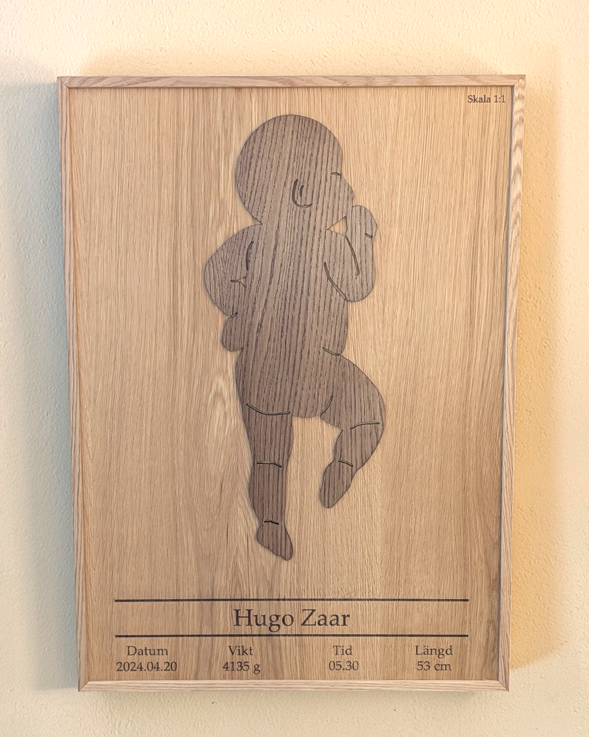 Därefter skapar vi en unik och personlig födelsetavla där bebisen på tavlan blir lika lång som ditt barn vid födseln. Bebisen är utskuren och limmad för att få ett djup i tavlan och längst ned på tavlan är barnets födelsevikt- och längd samt namn och födelsedatum ingraverat.